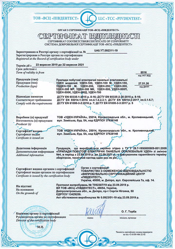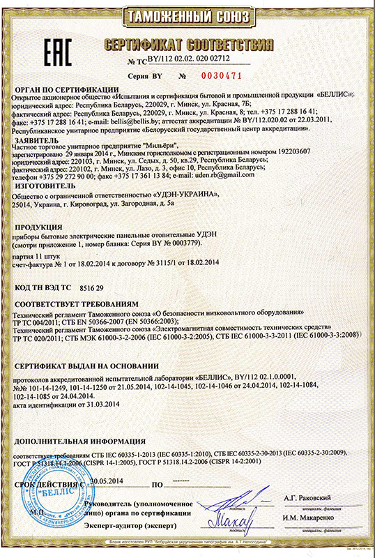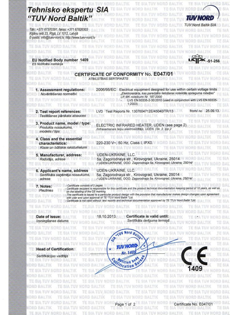 Certificate of conformity СЕ (UDEN) 1ст.